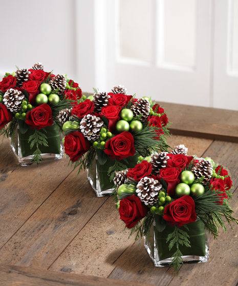 Share the holiday joy with this festive bouquet of fresh red roses, hypericum, Christmas greens and snow-tipped woodland cones. Whether as a tabletop centerpiece, a merry addition to the mantel or a seasonal surprise for someone special, it's sure to deck the halls with style. Express same day delivery around Atlanta and across the USA.