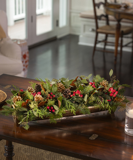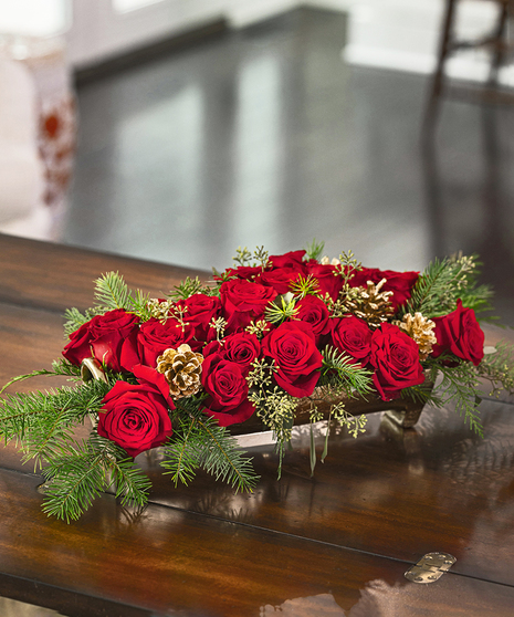 Guaranteed to turn your holiday table into a showcase! Featuring two gold centerpiece trays of holiday cedars, pine, and magnolia with a centerpiece of festive mountain red roses. Perfectly sized to enjoy together or individually as centerpieces or room accents.