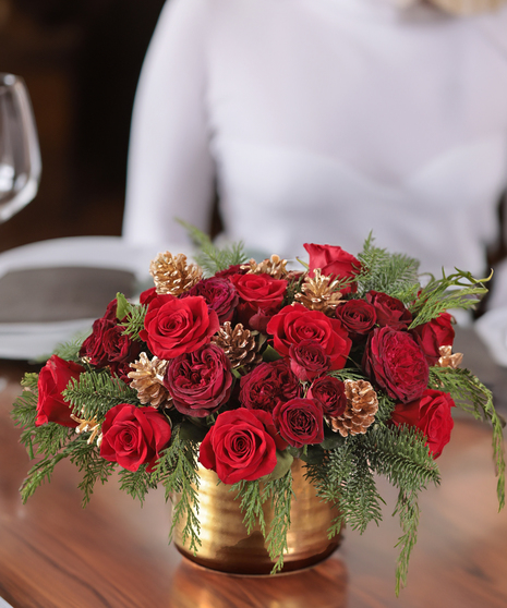 Gorgeous Ecuadorian red roses, English Tess garden roses, tea roses nestled in scented cedars, pine and holiday berries, presented in a chic gold keepsake vase.
