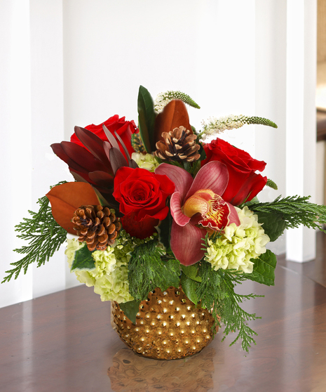 Deliver Happy Holiday wishes with our festive holiday petite featuring blooming hydrangea, red mountain roses, exotic orchids, winter cedar, pine, berries, and southern magnolia artfully arranged in a gold keepsake container they will enjoy for years to come.