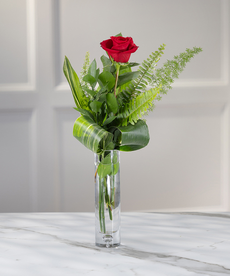 Deliver our upgraded twist on a classic floral gift, the rose budvase, featuring Carithers luxury Ecuadorian mountain roses in an upgraded chic vase nestled in tropical foliage. Always a perfect gift for any occasion.