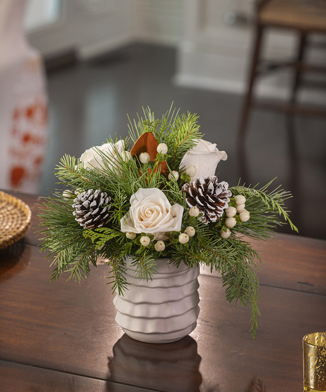 You will love our festive winter centerpieces featuring white mountain roses, snow-tipped pine cones, soft pine, southern magnolia, scented cedars, and mountain berry artfully arranged in a chic ceramic vase. Perfect to display as a set on a banquet table (shown) or use individually for party centerpieces or room accents