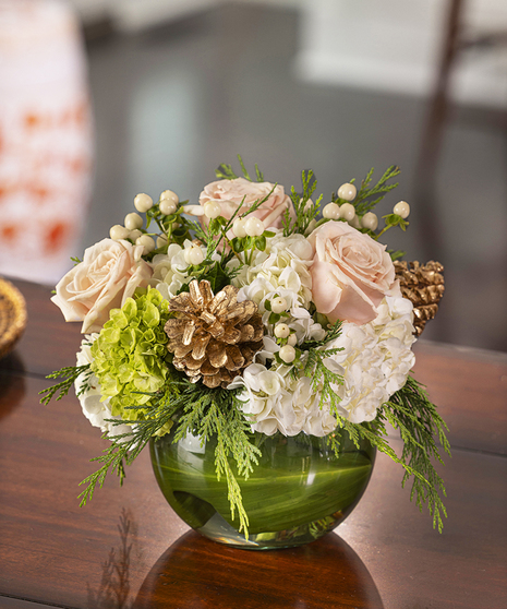 Celebrate winter with this gorgeous arrangement featuring Winter Hydrangea, hypericum berries, blush mountain roses, winter greens and gold pinecones artfully arranged in a leaf-lined bubble bowl.