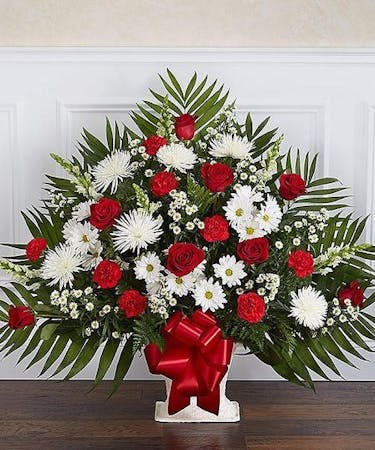 Always popular, a sympathy basket is a fitting expression and tribute to a loved one, featuring red roses, white fuji poms & daisies, red dianthus, mini carns, gladiolas, asters and and deluxe floral greenery.